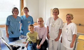 Bildunterzeile: PD Dr. Susanne Thiele-Schmitz (Oberärztin), Dr. Daniela Plogmeier (Oberärztin), Leon und seine Mama Alissa, Birgit Figge und Ina Niederhaus (Diabetesberaterinnen).