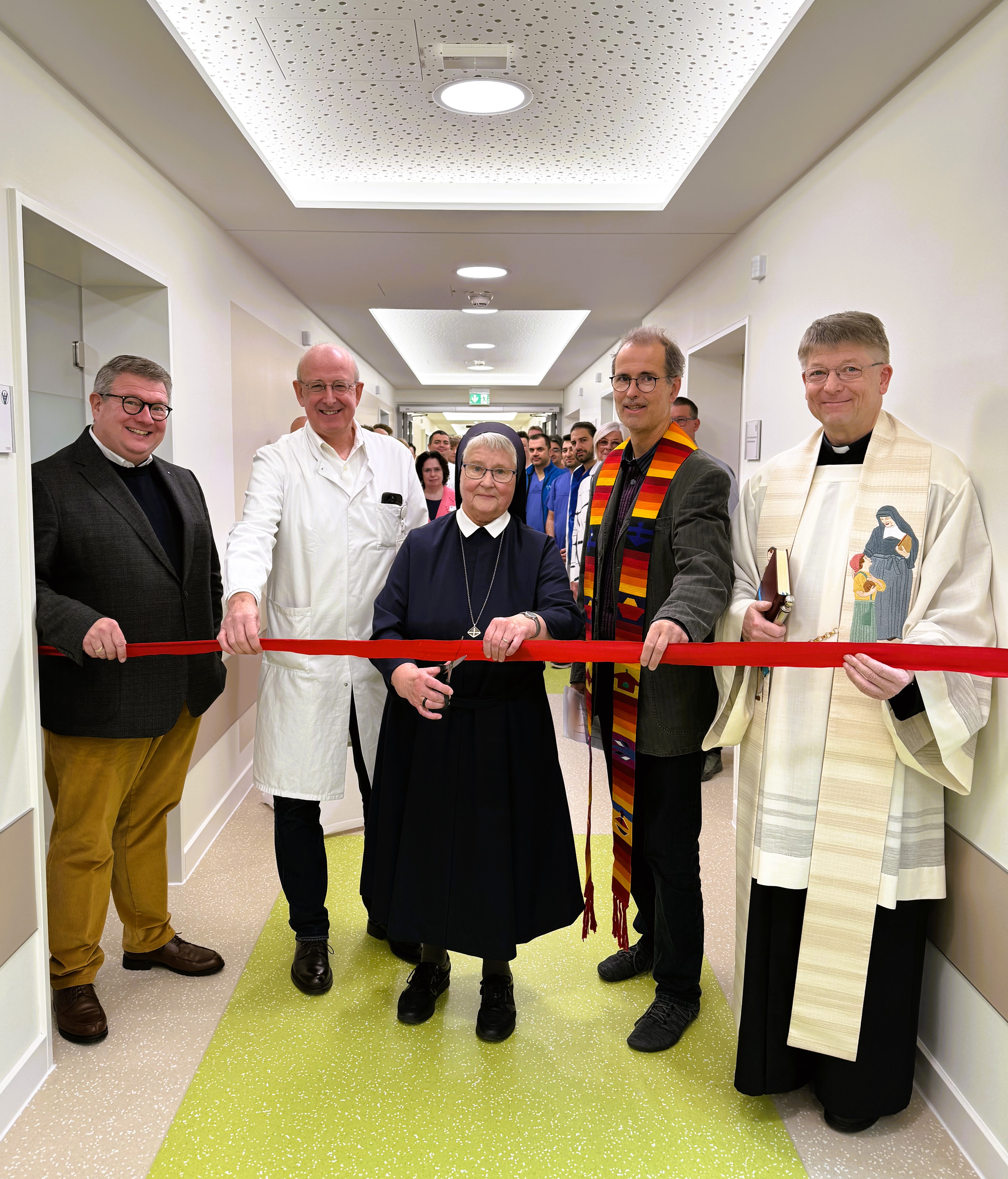 Die modernste Ausstattung und optimierten Arbeitswege ermöglichen effizientere Abläufe und eine noch patientenorientiertere Versorgung. Die Umbaumaßnahme, die ursprünglich als kleinere bauliche Anpassung geplant war, entwickelte sich im Verlauf zu einem deutlich umfangreicheren Projekt. „Wie das in Altbauten oft der Fall ist, zeigte sich schnell, dass beispielsweise Leitungen komplett erneuert werden mussten“, berichtet Geschäftsführer der St. Vincenz Kliniken Markus Funk. „Umso größer ist unser Dank an die Abteilung Bau und Flächenmanagement, die mit enormem Engagement eine hervorragende Arbeit geleistet hat.“ Im Rahmen der Einweihung wurden die neuen Räumlichkeiten sowie die dort tätigen Mitarbeitenden und Patientinnen und Patienten durch Pfarrer Rose gesegnet. Pfarrer Hartwig Glöckner hob in einer Ansprache die besondere Bedeutung des Herzens hervor. Seitens der Genossenschaft der Barmherzigen Schwestern vom Hl. Vincenz von Paul nahm Sr. Daniele teil, die feierlich die Schleife durchschnitt und damit den Bereich offiziell eröffnete.